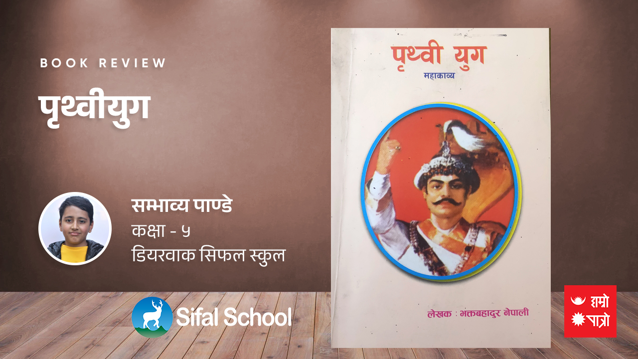 महाकाव्य झ्याउरे लयमा तयार पारिएकाे छ । यो पुस्तक हाम्रो उमेर समूहदेखि ठुला उमेर समूह सबैका लागि राम्रो छ । यो महाकाव्यमा हाम्रो देश २२, २४ राज्य कसरी एउटै सिङ्गाे नेपाल भयो । कसरी पृथ्वीनारायण शासले एकीकरण गरेर नेपाल देश बनाए । यो किताब पढदा आज भन्दा ३०० सय वर्ष अगाडिको इतिहास थाहा पाउँछौँ । हामीले इतिहासको बारेमा पढ्ने अवसर पायौं । म यो पृथ्वीयुग महाकाव्य मेरो उमेर समूह र मभन्दा ठुलो दाजु दिदी सबैलाई सिफारिस गर्न चाहन्छु । मलाई यो पुस्तक निकै मन पर्यो त्यसैले म यो पुस्तक सिफारिस गर्न चाहन्छु ।